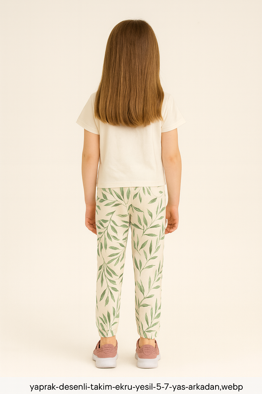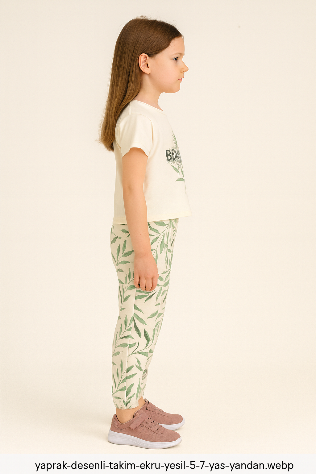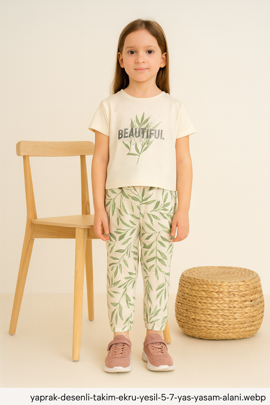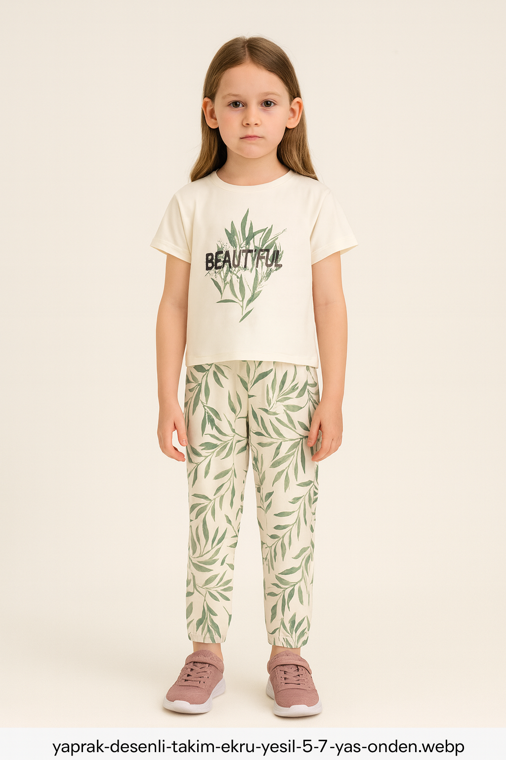 Beatıful yazılı yaprak desenli pantolonlu kız çocuk takım – ekru-yeşil renk – 4 – 8 yaş