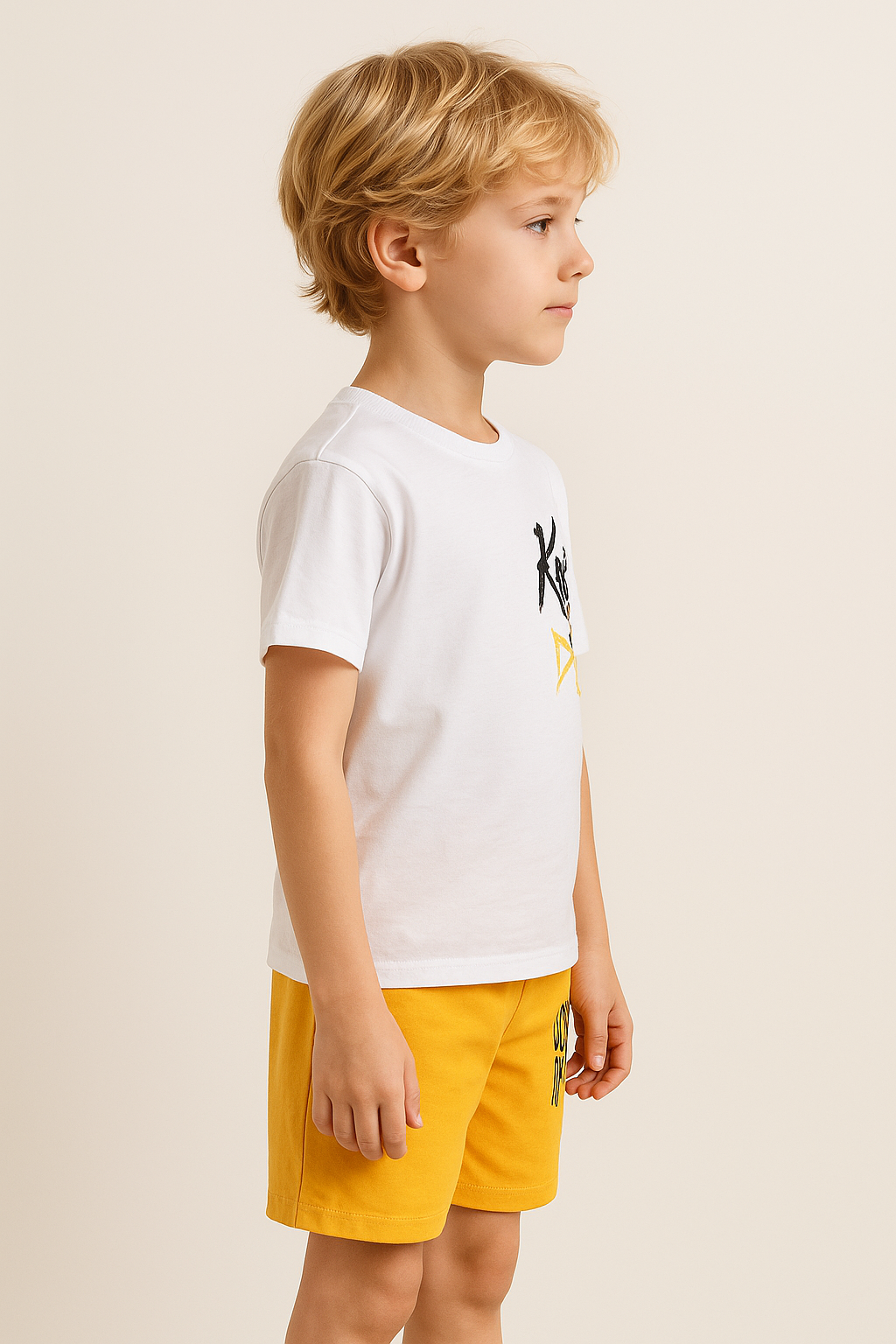 Erkek çocuk baskılı kısakollu şortlu 2'li takım – beli lastikli – cepli – sarı renk -7 -10 yaş