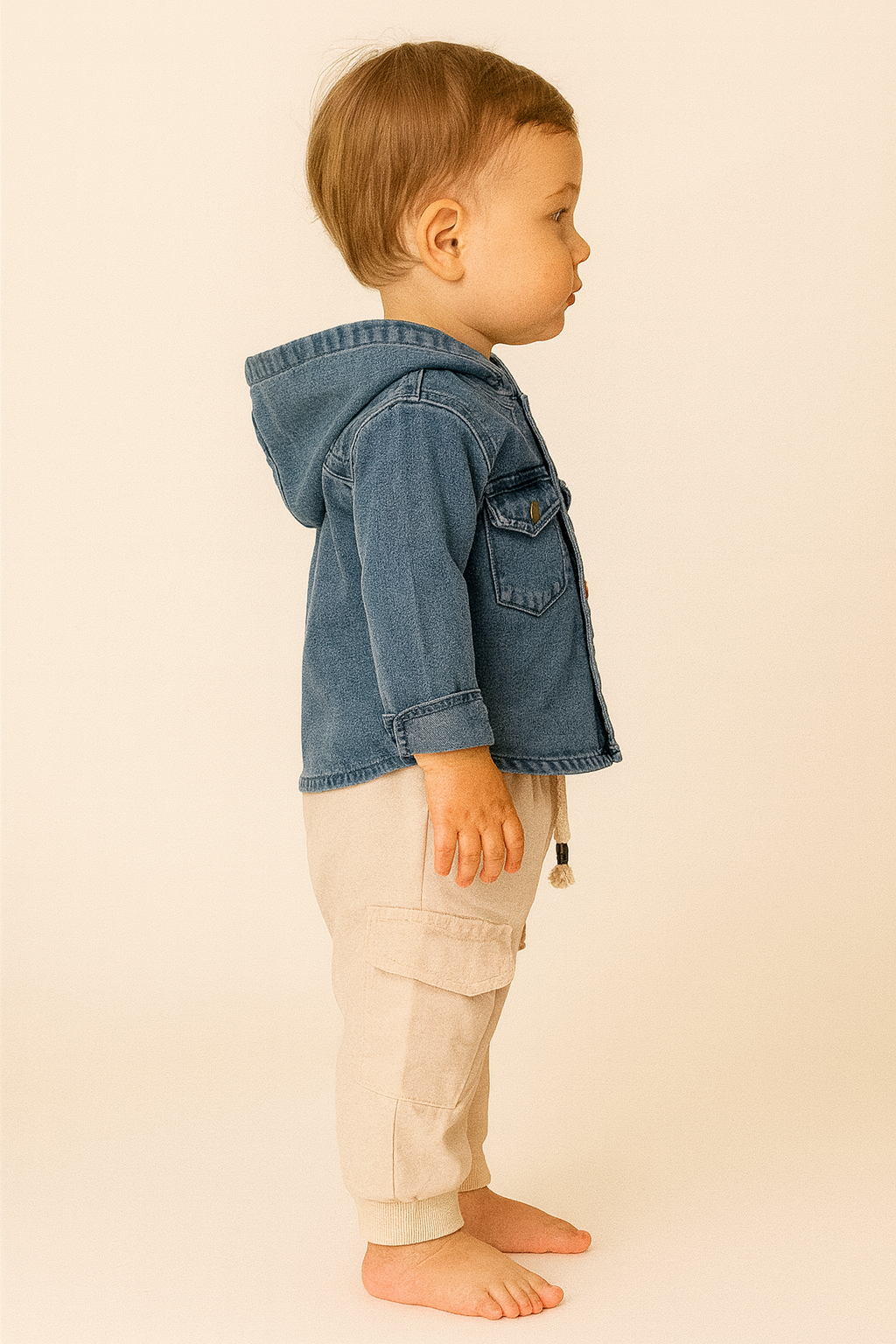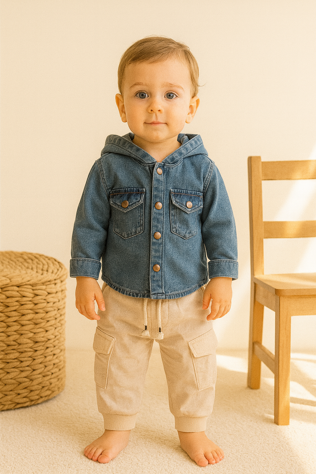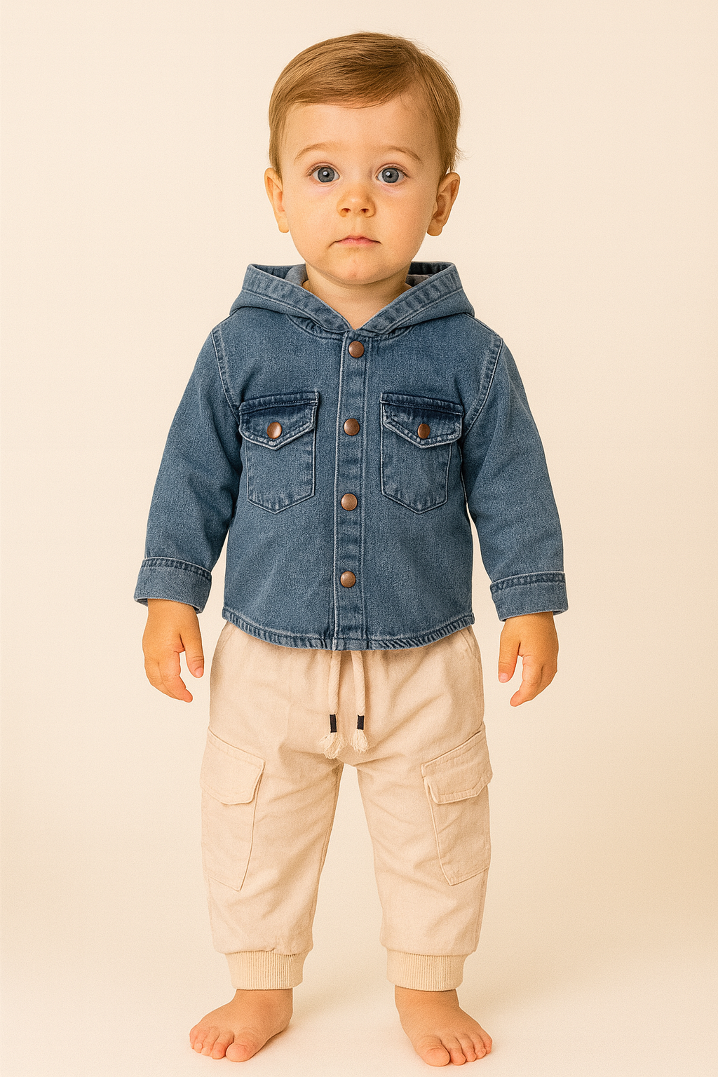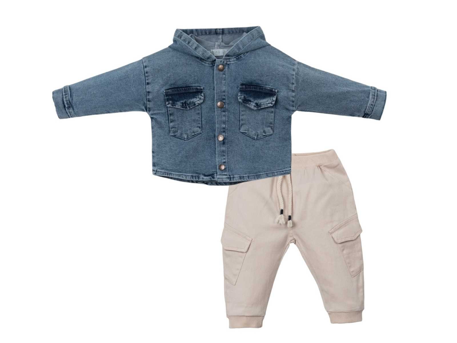 Erkek çocuk kot gömlekli kapşonlu cepli kargocepli pantolonlu 2li kot takım