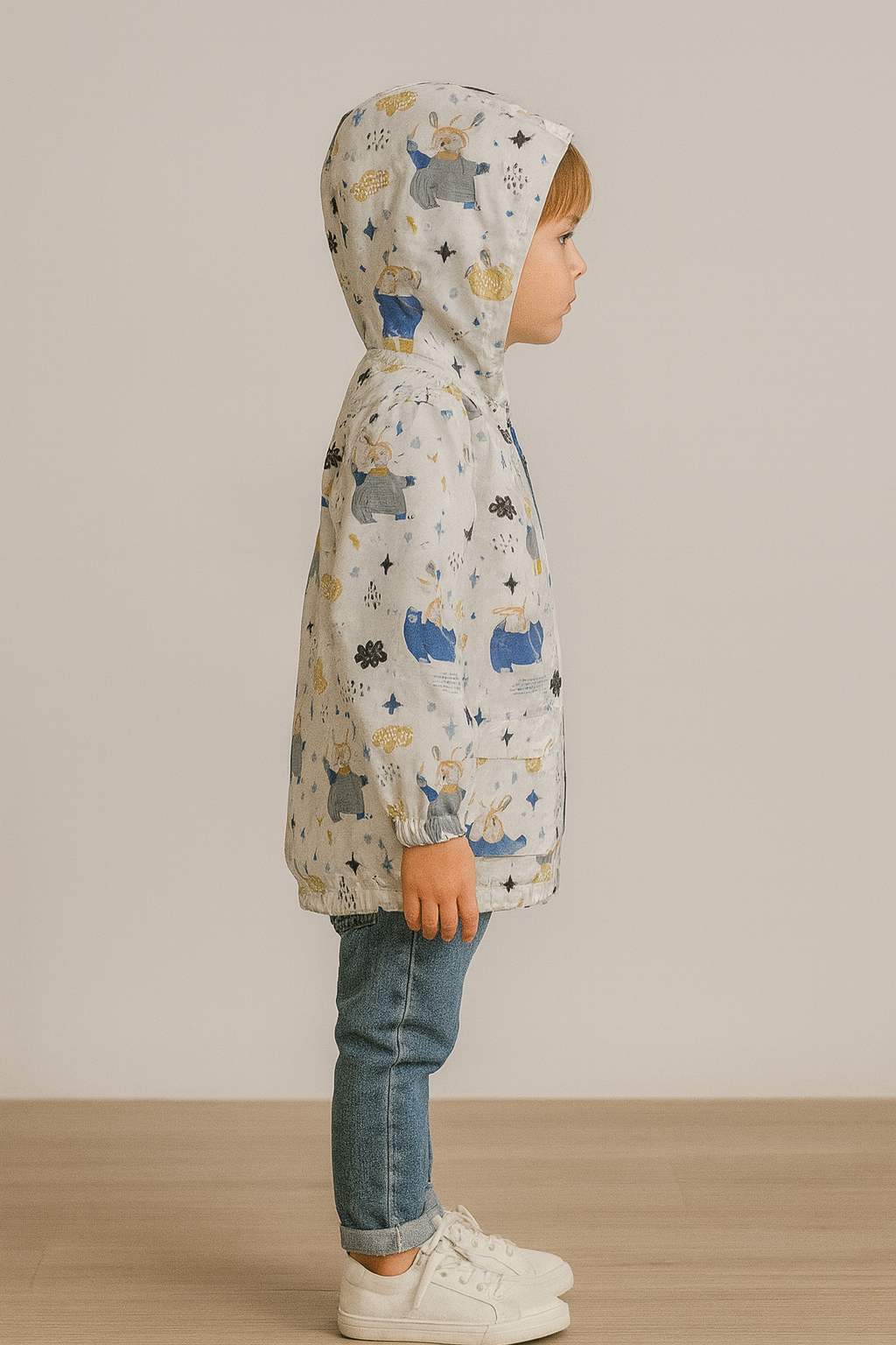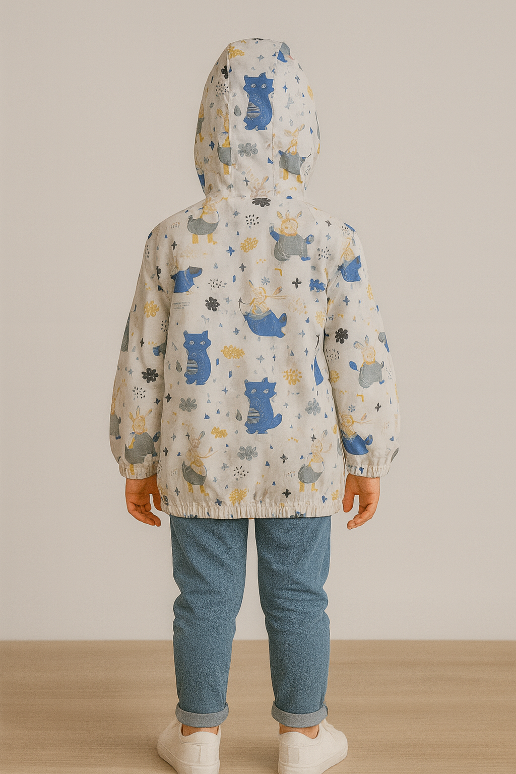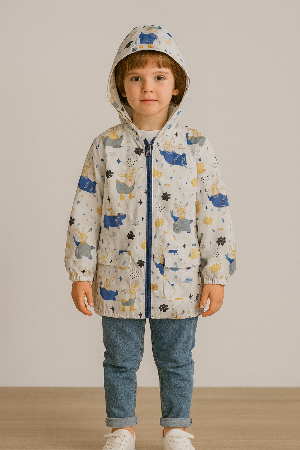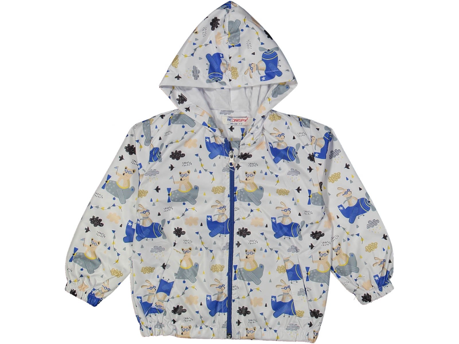 Erkek çocuk uçak baskılı fermuarlı kapşonlu yağmurluk – kol uçları lastikli – beyaz-mavi renk – 1 – 4 yaş