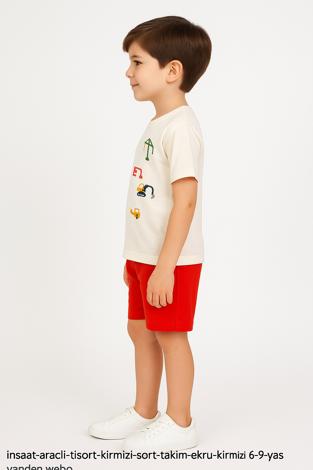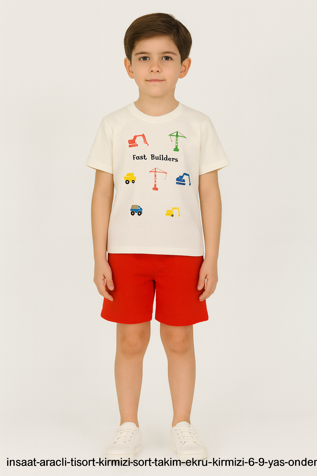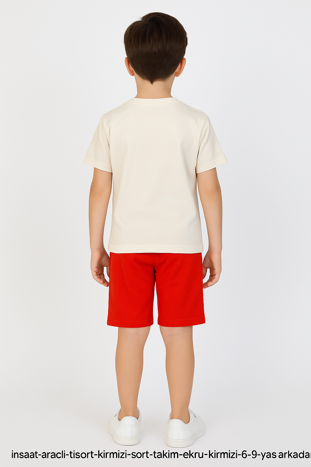 İnşaat Makineleri Desenli Erkek Çocuk Takımı (Beyaz Tişört & Ekru Şort)