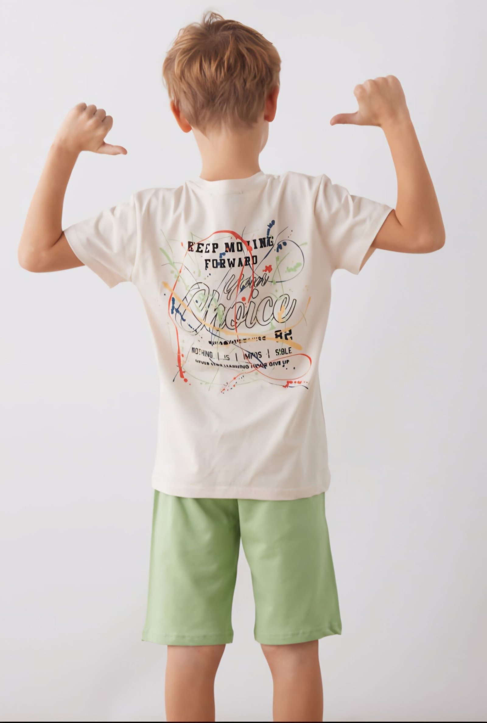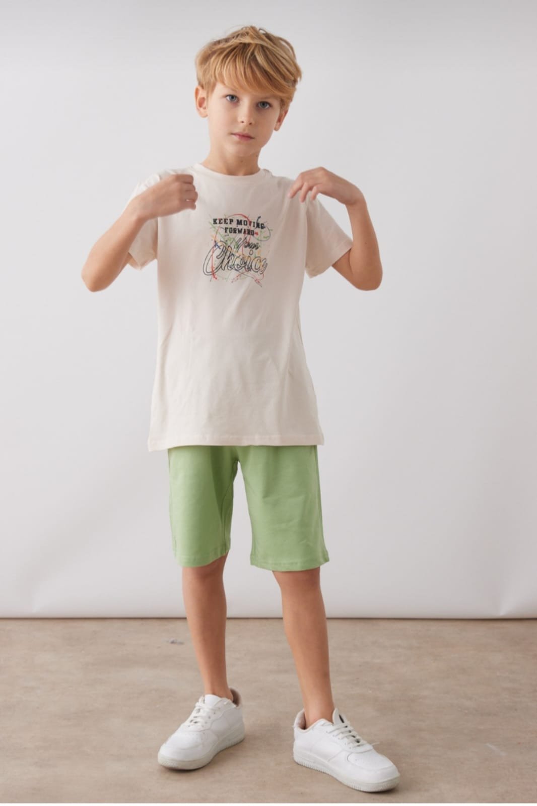 Keep moving forward yazı baskılı kısa kollu şortlu erkek çocuk takım – krem – yeşil renk – 4 – 8 yaş
