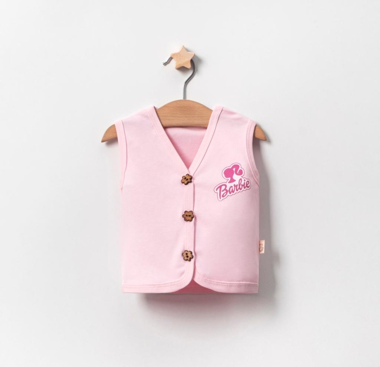 Kız bebek barbie baskılı ahşap düğmeli penye yelek