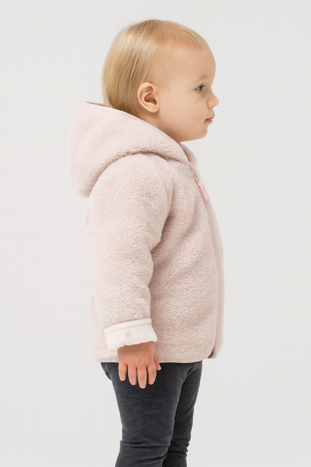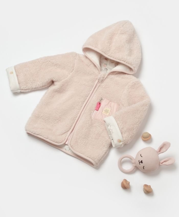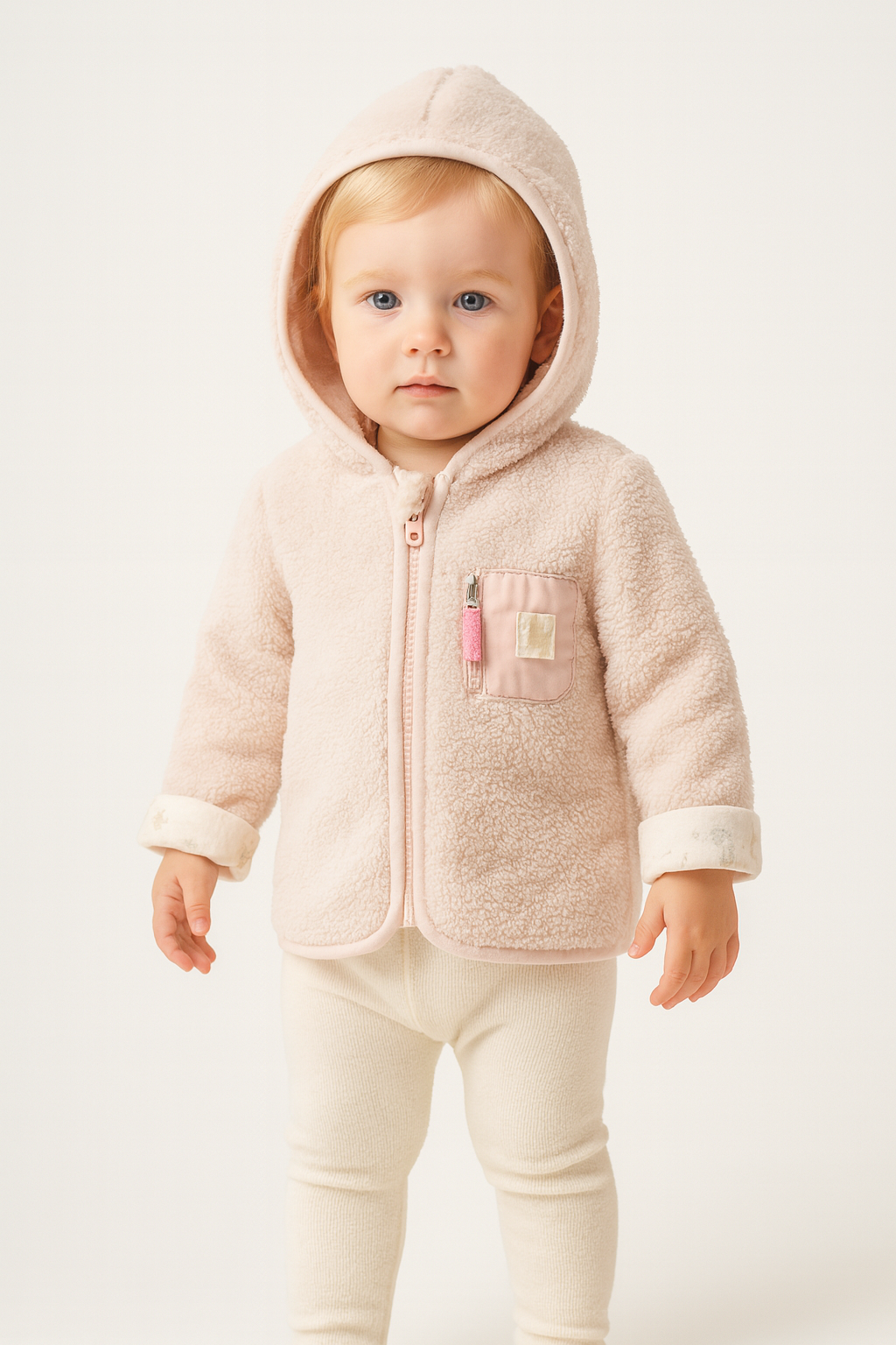 Kız bebek fermuar cep detaylı kapşonlu peluş mont