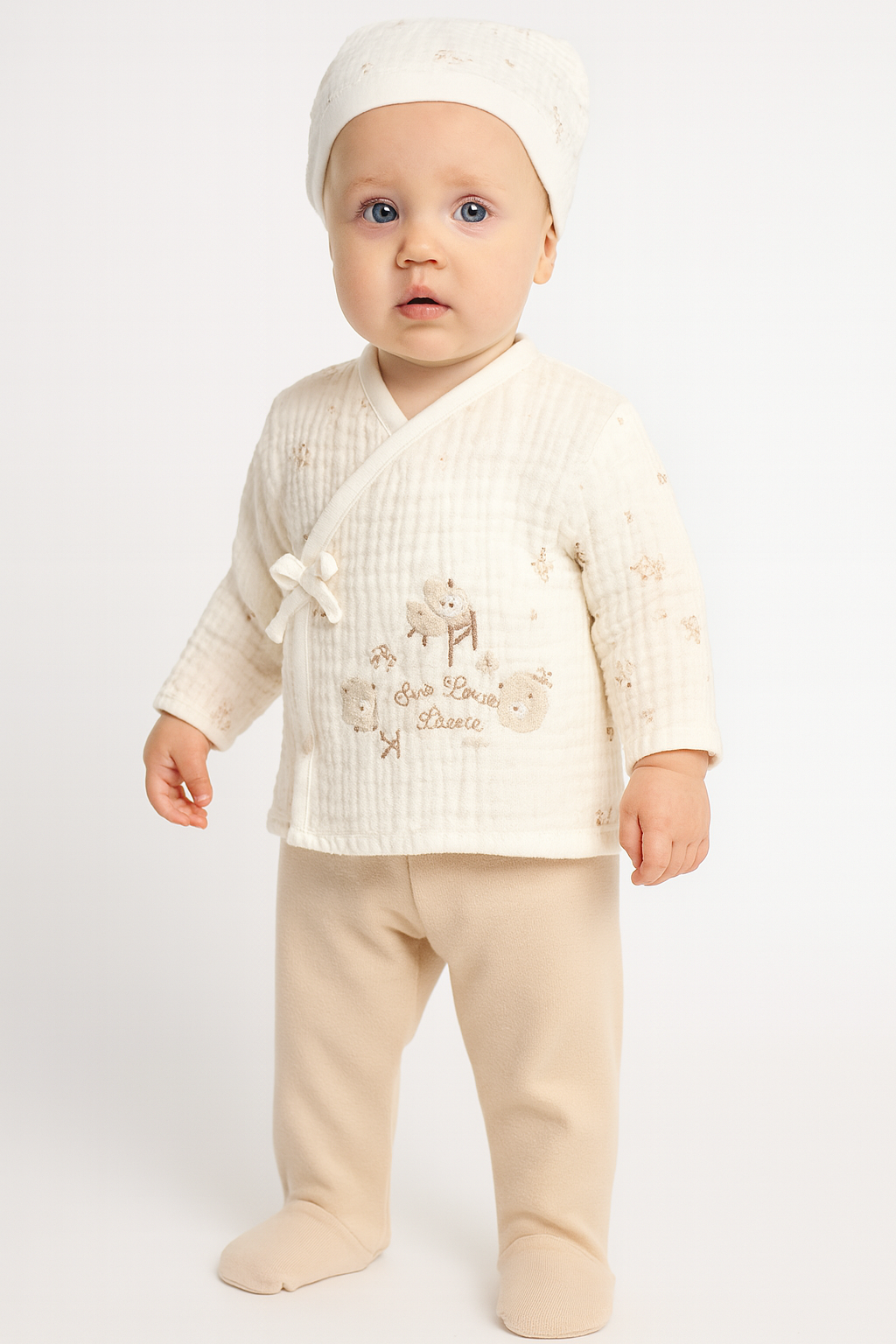 Kız bebek yandan çıtçıt detaylı 3'lü Bej Zıbın Seti – müslin kumaş – organik – 3 – 9 ay –