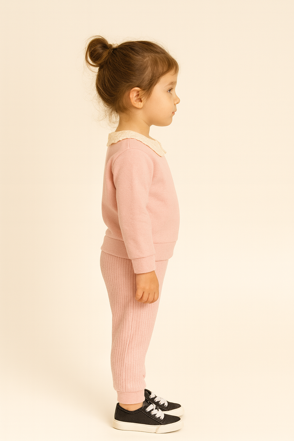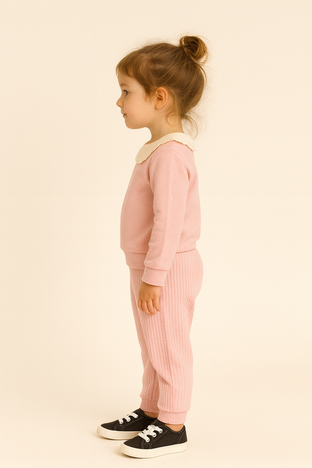 Kız çocuk yakası dantelli pembe renk cute girl fitilli pantolonlu takım